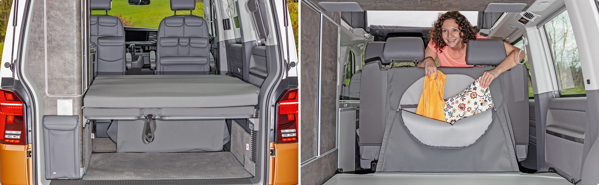 Le sac à dos de banquette FLEXBAG offre un rangement d’environ 266 l lorsque la banquette 2 places du California VW est avancée au maximum : beaucoup de place bien protégée pour la literie et/ou les bagages.