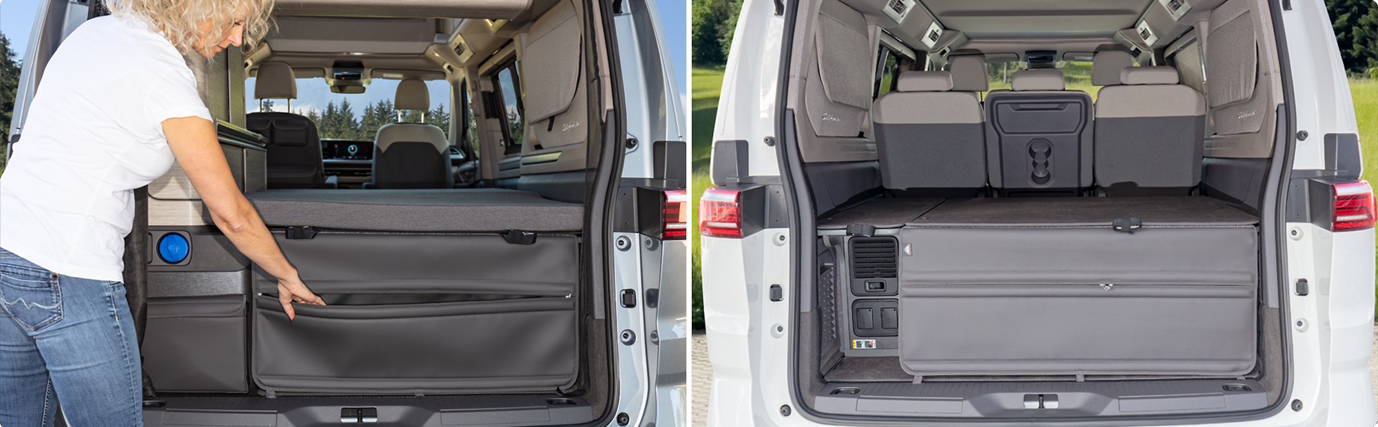 Le FLEXBAG Arrière pour VW T7 California Ocean / Coast est une fermeture de coffre élégante et un espace de rangement pratique pour les objets nécessitant un accès facile pendant les déplacements, ainsi que pour un usage quotidien.