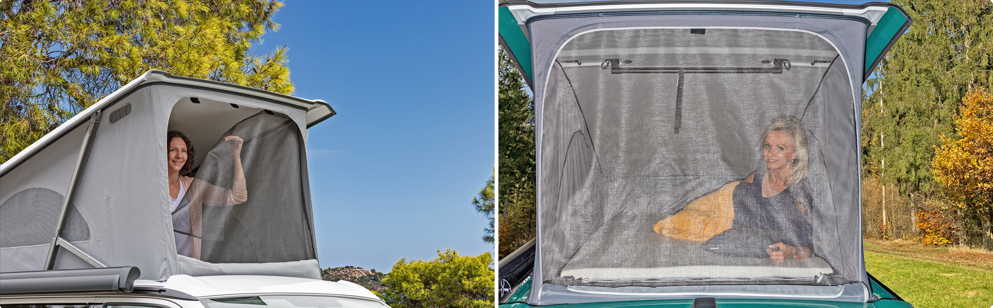 ISO-TOP MK VI peut rester en majeure partie installée dans le toit relevable : ce sont seulement la paroi de devant et la moustiquaire FLYOUT en option qu'il faut impérativement retirer avant de fermer le toit relevable.