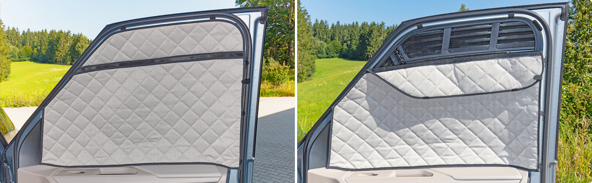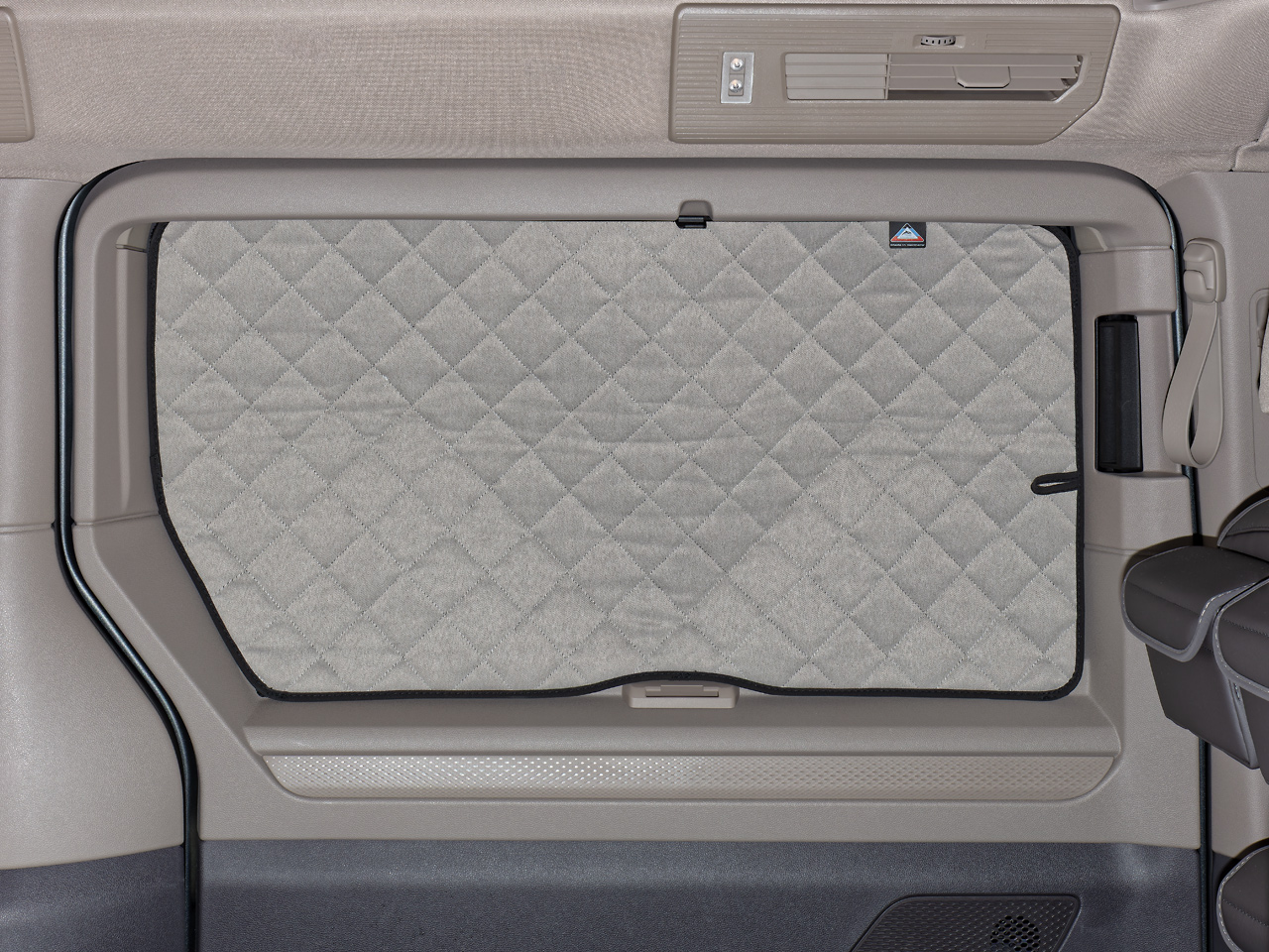 ISOLITE ® Extreme pour les vitres latérales de la cabine du VW T7 peuvent être rabattues et fixées dans la partie supérieure lorsque l'insert de ventilation VW ou le FLYOUT pour les vitres conducteur/passager sont utilisés.