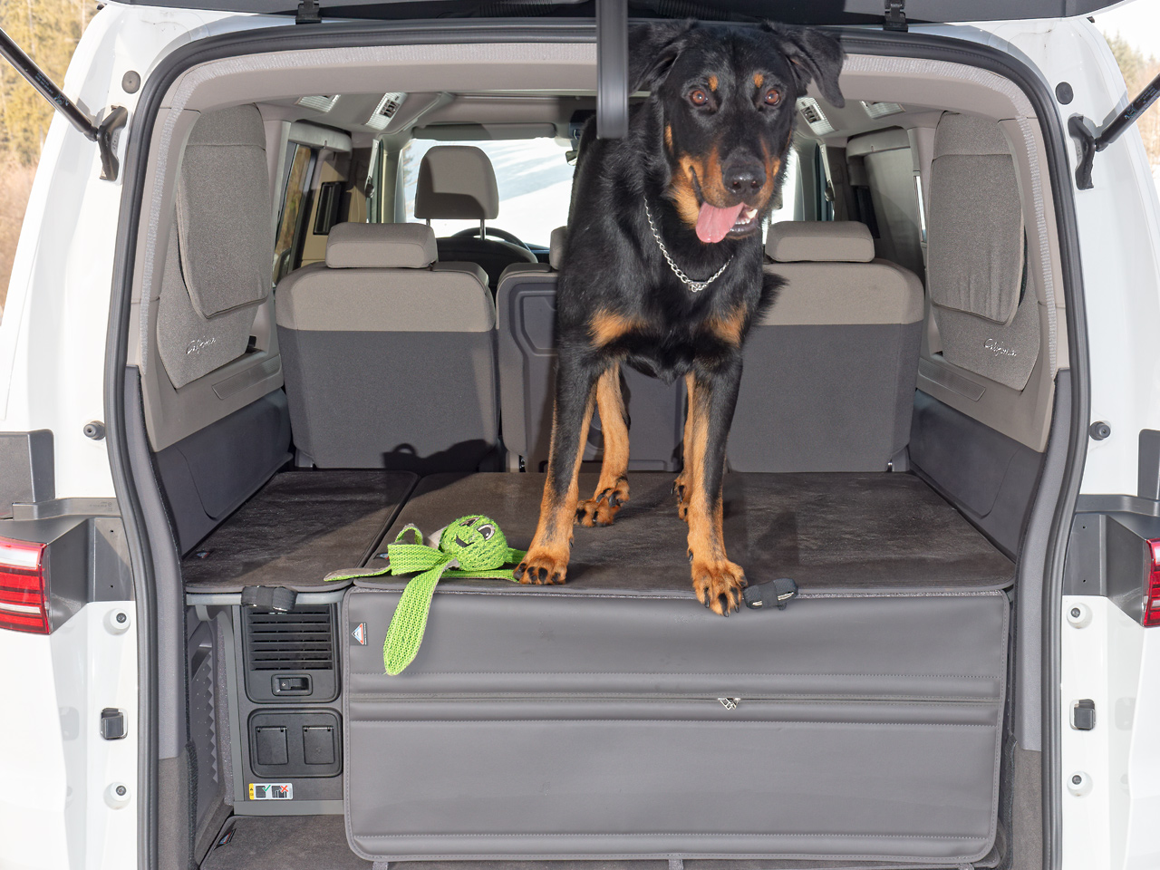 Le tapis de benne iXTEND PAD® pour VW T7 California Beach Tour est composé de deux parties, permettant ainsi de protéger le compartiment électronique même lorsque le grand tapis de benne est retiré pour transporter des objets encombrants, des vélos, une grande cage pour chien, etc.