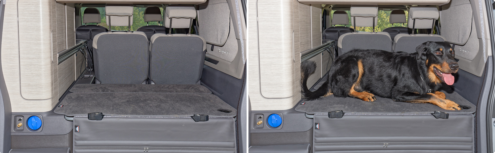 iXTEND PAD ® est fabriqué à partir du même matériau extrêmement résistant que celui utilisé pour tous les tapis en velours du VW T7 California. Ce matériau est imperméable, permettant même à un chien mouillé de s'y asseoir.