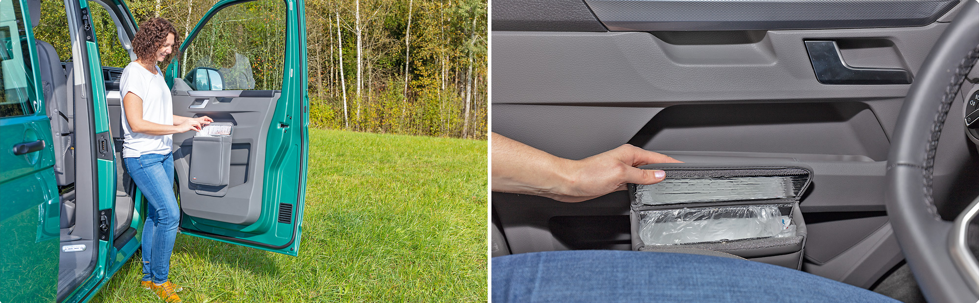 MULTIBOX VW T6.1, la poche élégante qui s’adapte aux portières avant de tous les T6.1 VW. La MULTIBOX se fixe en haut à l’intérieur du vide-poches avec une bande contact autoagrippante et elle tient de même en bas avec une bande autoagrippante.