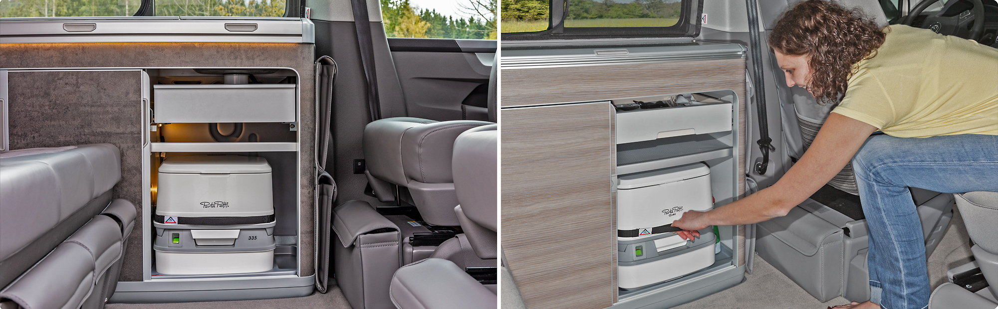 Toilettes « Porta Potti 335 » avec sangle de manutention et baquet de protection pour T6.1 / T6 / T5 VW California avec côté de l’évier