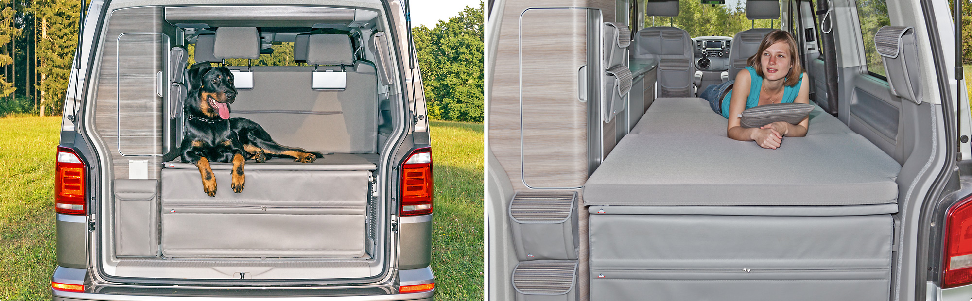 Allround sur tous les T5 VW California Comfortline (et Trendline) et sur les T6 VW California Ocean/Coast lorsque l’on se sert de la rallonge de lit dans la position inférieure et sur le matelas de coffre de série d’origine.