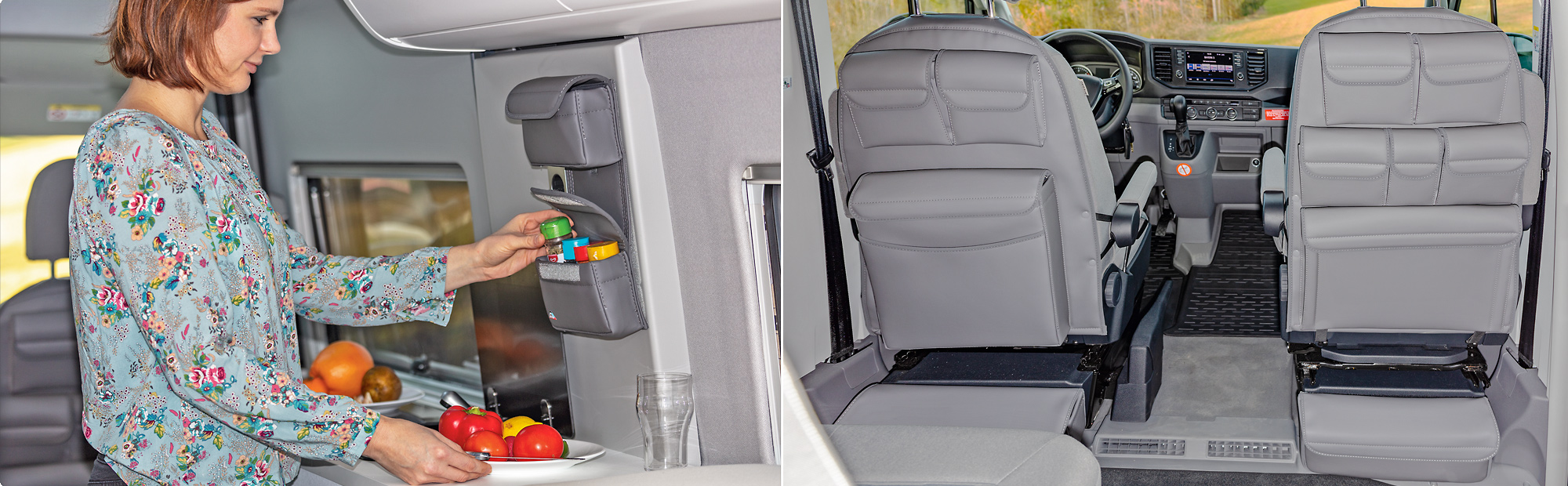 UTILITY avec 1 poche pour l’armoire de rangement à gauche et UTILITY avec deux poches à droite au-dessus de l’ensemble banquette fauteuils du Grand California 680 VW.