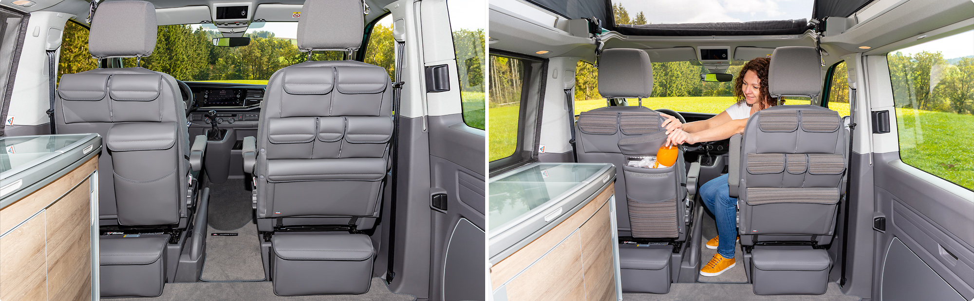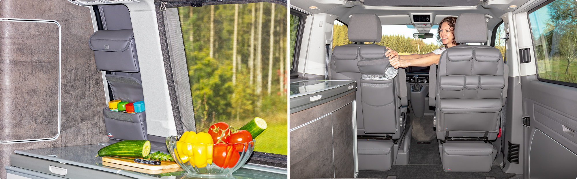 Pochettes de rangement pour le coffre sous le lit : une pochette côté trappe à skis ; deux pour le devant ; pochette pour l’avant gauche du coffre (Beach : il est impératif de le décrocher lorsque la banquette est complètement repoussée vers l'arrière).